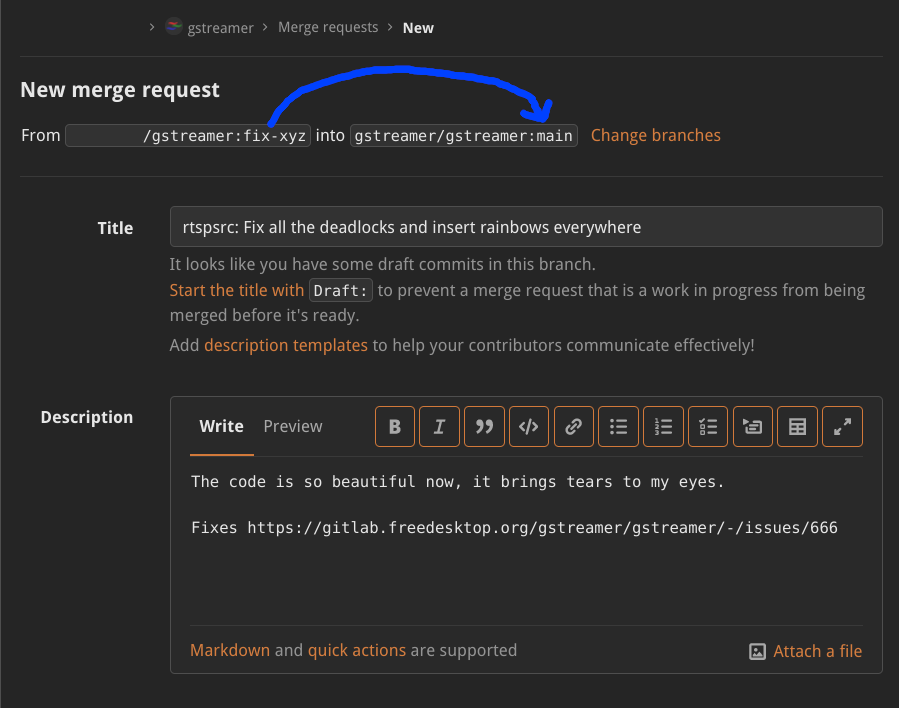 The merge request workflow can be confusing to people unfamiliar with it, so add screenshots. Also add a new section on how to revise merge requests, since a lot of people tend to open new merge requests to make any changes. Eliminate the separate "How to Prepare a Merge Request for Submission" section -- merge it with the main section. Part-of: <https://gitlab.freedesktop.org/gstreamer/gstreamer/-/merge_requests/1367>