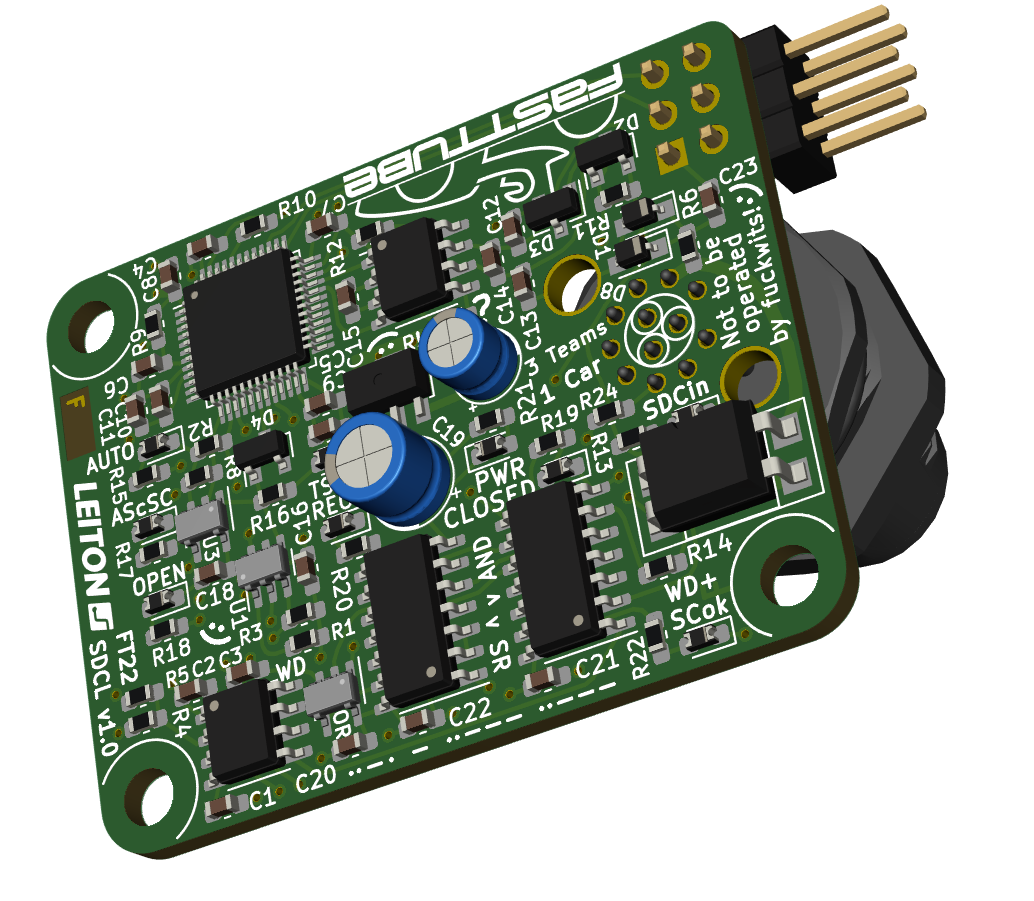 It therefore sits in the last spot before the TSMS in the SDC and is also the link between the TS activation buttons on dashboard and sidepanel and the ECU/Autobox.
